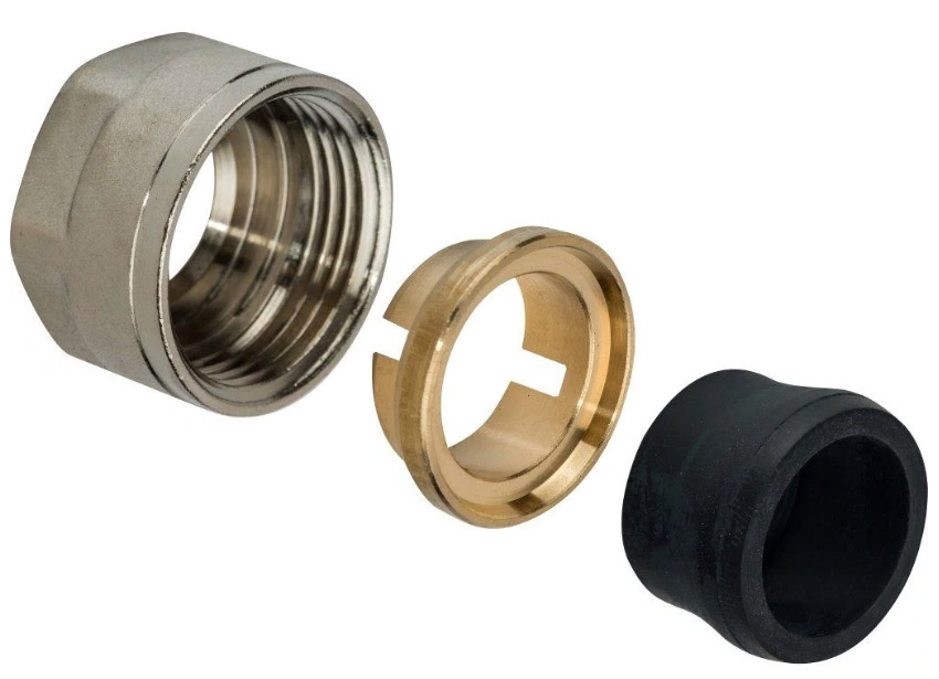 В конструкции фитингов первого типа присутствует штуцер – пружинистая разрезная втулка. Данный элемент и обеспечивает прижатие стенок трубы к уплотнительному кольцу, надетому на ее наружную поверхность. Именно такая втулка, диаметр которой должен строго соответствовать размеру внутреннего сечения трубы, наделяет создаваемое цанговое соединение требуемой степенью герметичности и надежности.