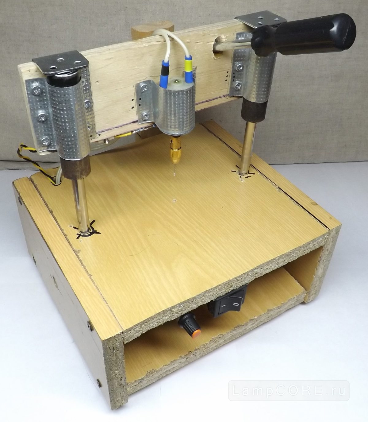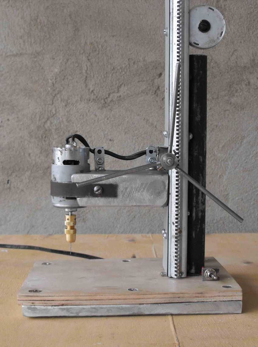 Многие радиолюбители либо уже имеют, либо очень желают иметь в своей мастерской аппарат для сверления отверстий в платах. Зачем покупать в магазине дремеля, если можно создать мини-сверлильный станок своими руками? От своих традиционных аналогов настольный станок отличается миниатюрными габаритами, соответственно, все его детали также имеют небольшие размеры. Как правило, вес таких устройств не превышает 5 кг, станина — площадка 300х300 мм, высота около 250 мм.