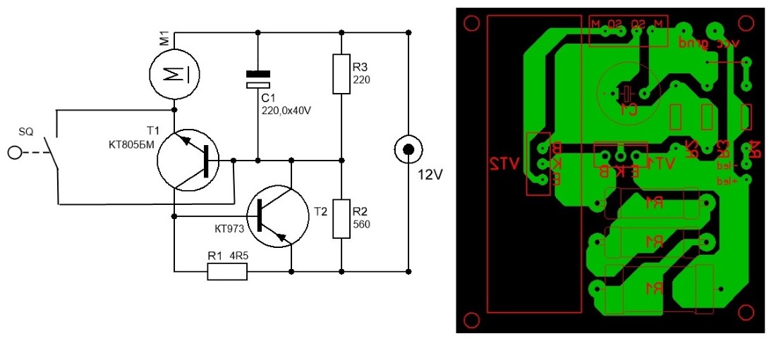 Но на этом остановиться было-б слишком просто! На мотор прикошачил схемку с автоматическим регулированием оборотов мотора в зависимости от нагрузки, котору я подглядел у котов выложил Sansey. Кстати, очень хороший обзор схемок управления двигателем есть там-же. Рекомендую!