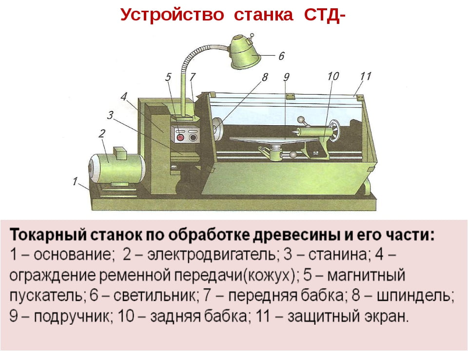 Первым делом стоит вспомнить все основные части конструкции того самого, школьного станка по дереву. Деталей здесь вроде и немного, но каждая из них выполняет определенную роль, без которой все превращается в груду металлолома.