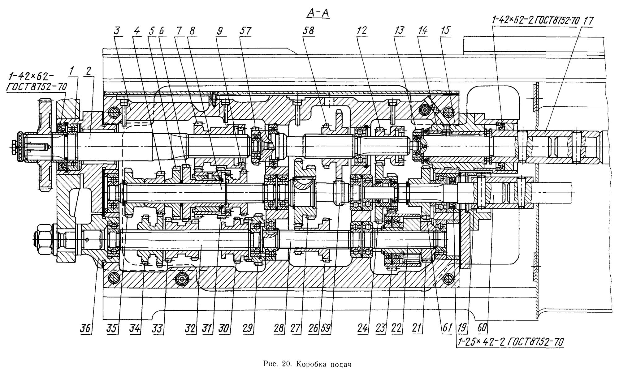 С редуктором внутри, состоящим из переключаемой зубчатой передачи. На нее, с использованием входного вала, идет крутящий момент от шпиндельного узла. С ходовым винтом, валом на коробке подач.