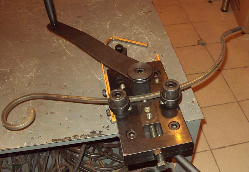 Покупной или сделанный самостоятельно «Гнутик» — универсальное приспособление, позволяющее получить дугу или угол из прута. Он представляет собой основание с ползуном, на котором закреплен упор с углом (90° или другим по необходимости) и двумя цилиндрическими неподвижными упорами. Перемещая ползун и угловой упор, прут сгибается под углом. Для получения дуги предусмотрен третий цилиндр, вращающийся на противоположной от углового упора стороне.