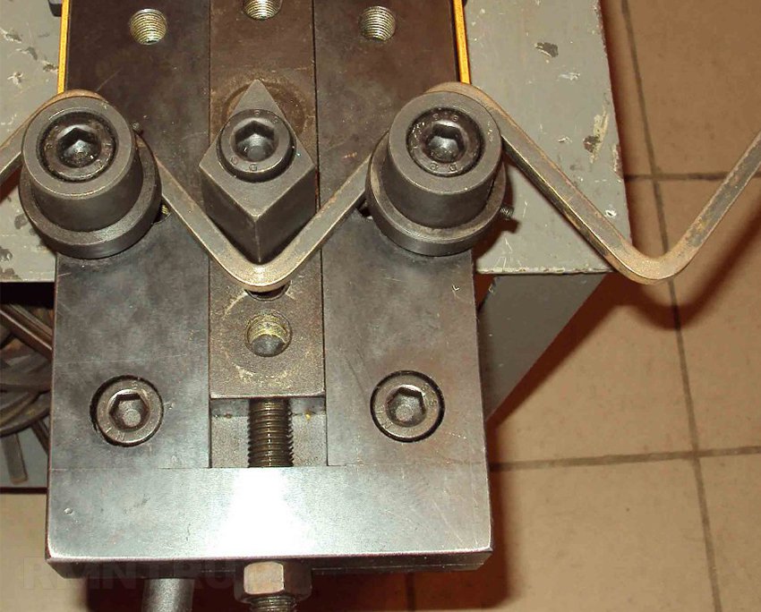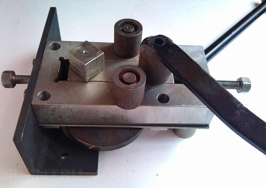 Работа с данным устройством довольно проста. Для начала вставляется конец прута или полосы в углубление приводной оси. Поворачивая эксцентрик, используя барашек, заготовка зажимается между его нижним концом и стенками углубления. Для этого ролик подводится к заготовке, ось ролика наворачивается гаечным ключом на 12 на ползун, зажимая его. Заготовка укладывается между эксцентриком центрального сегмента улитки и роликом.