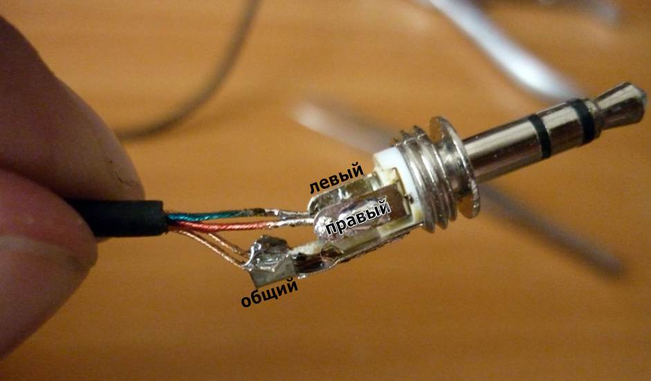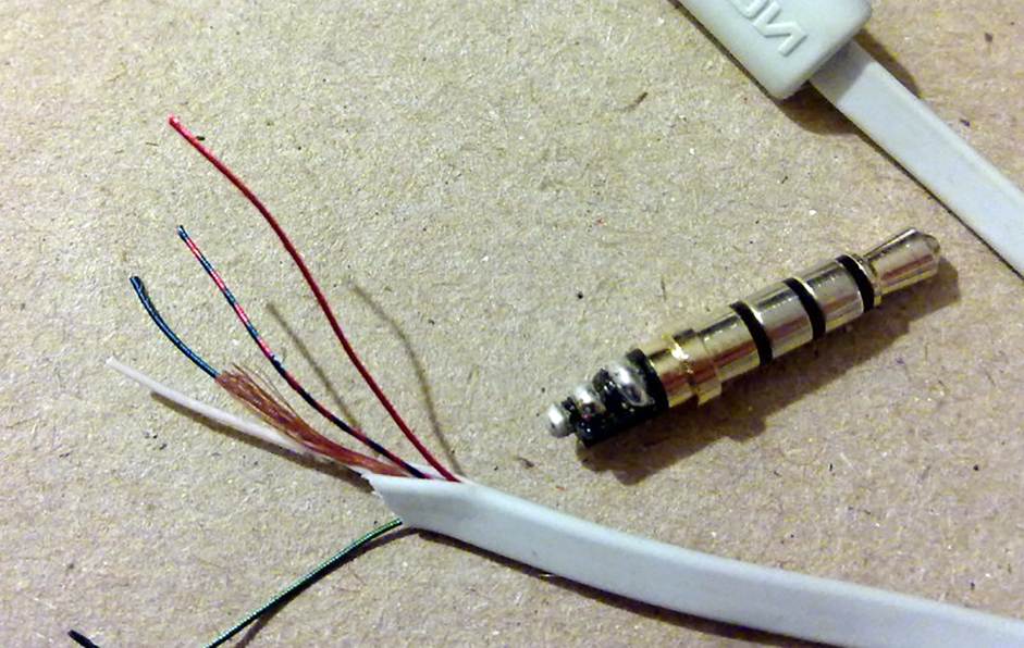 Скручивают все парные проводки как можно плотнее. Если их больше трех, то два лишних (ответственных за микрофон) можно спрятать или обрезать, ввод звука при этом перестанет работать. Иногда расцветки совпадают, но лучше проверить комбинацию, вставив разъем в гнездо плеера со включенной музыкой.