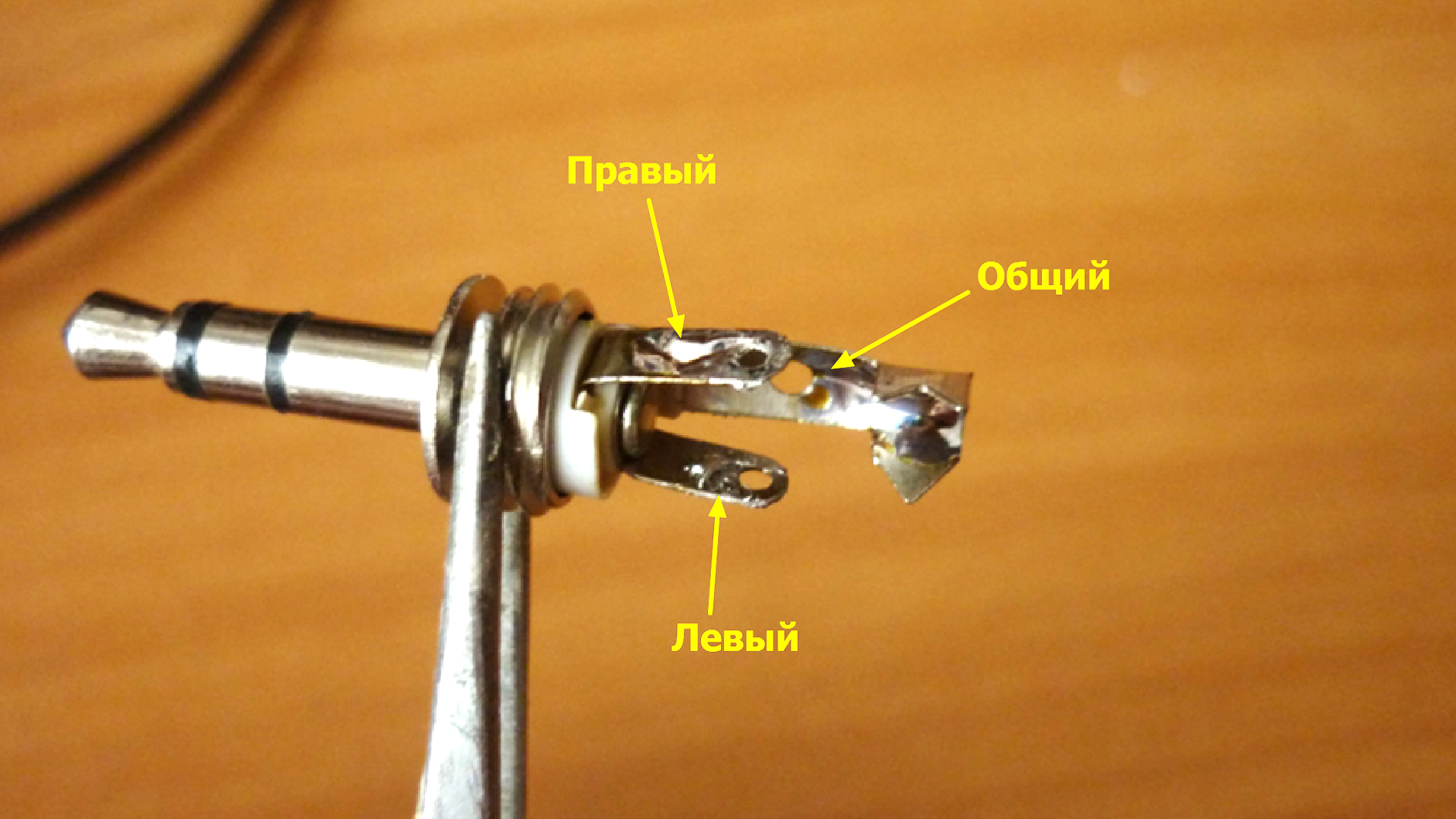 приступаем к припаиванию проводов к разъему. Рекомендуется начинать с общего, после чего уже паяем левый и правый каналы. Результат показан на фотографии;