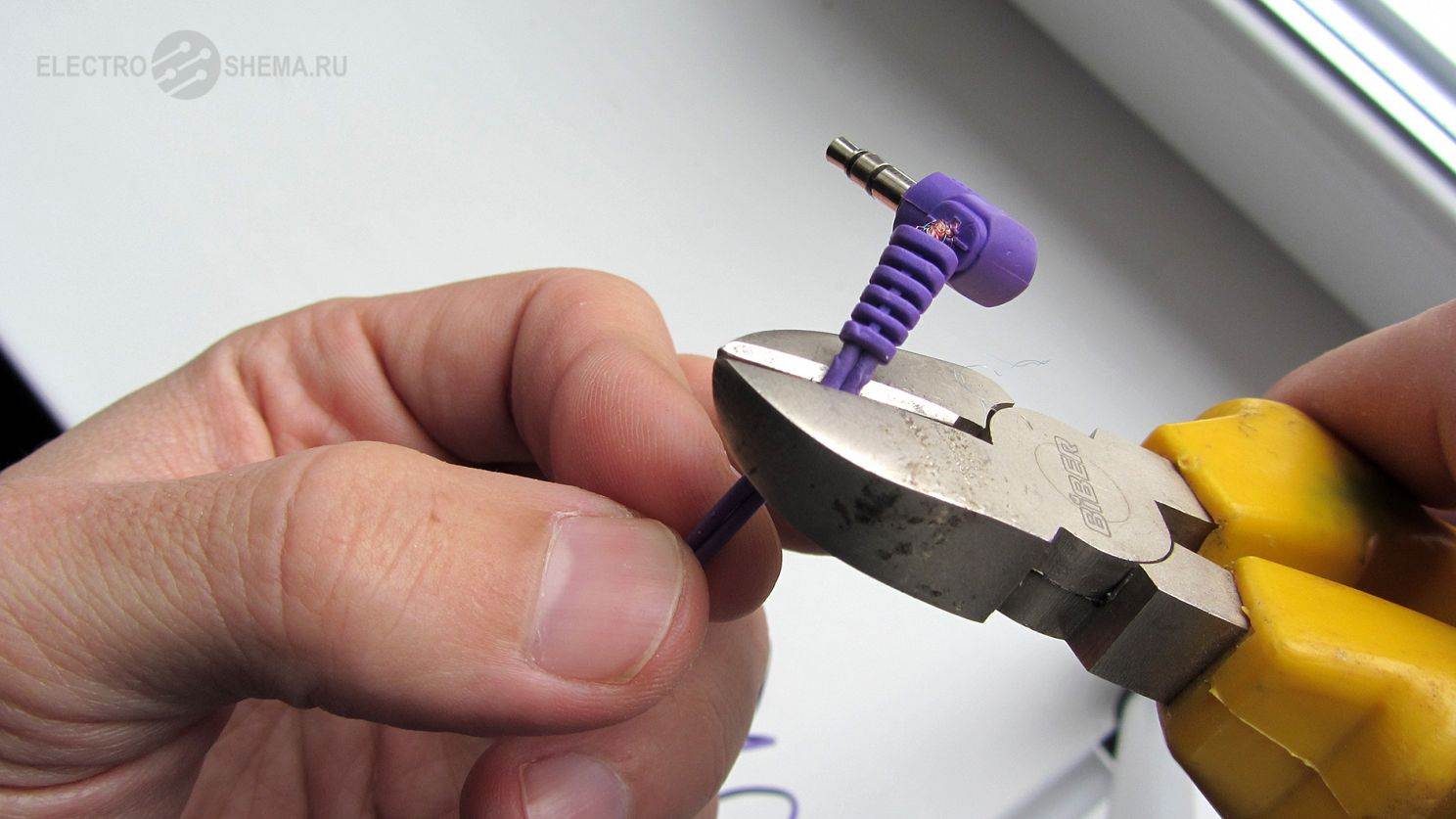Зачищать надо осторожно, иначе повредится тонкая жила. Один щуп мультиметра прислоняют к контакту штекера, а другой щуп ставят на зачищенный участок. Появление сигнала говорит, что из строя вышел участок входа в наушник