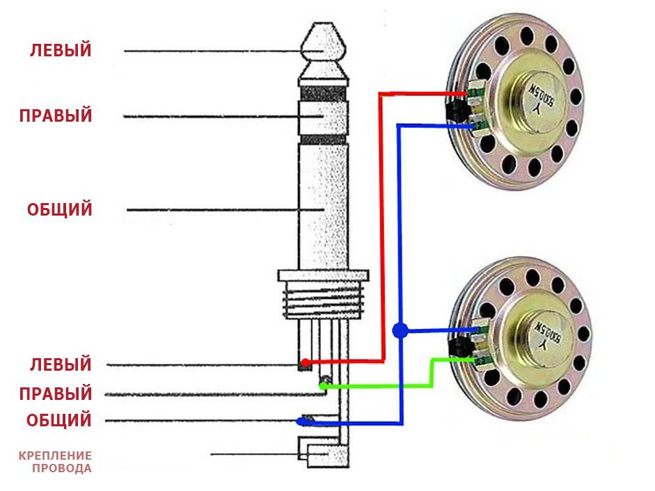 Эта картинка еще доступнее объясняет, куда припаивать провода к штекеру наушников: