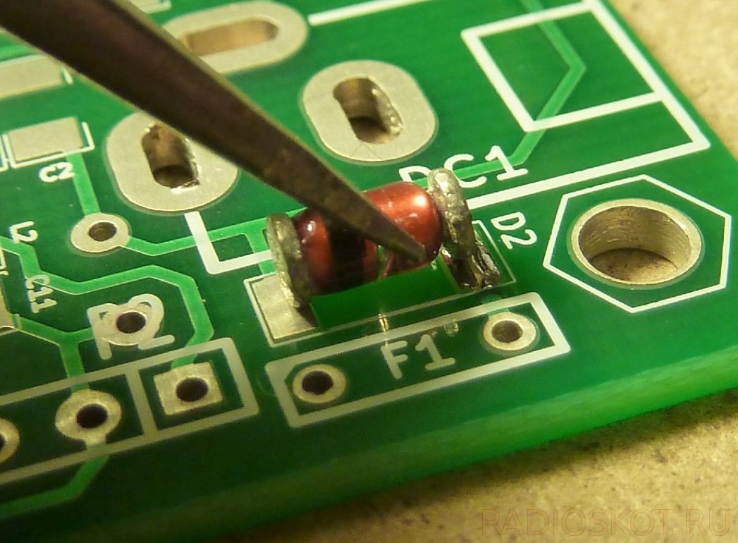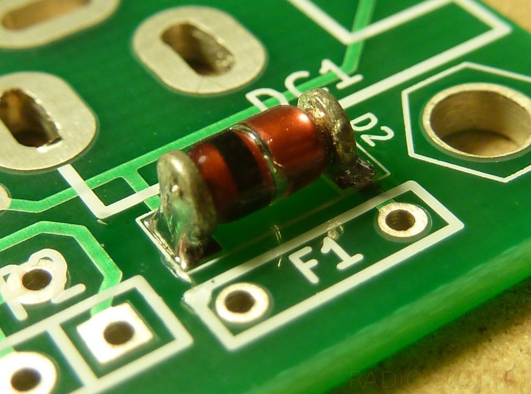 Размер корпуса закодирован в названии. Например, 1206 означает, что длина элемента составляет 120 мил, а ширина – 60 мил. Мил – это единица измерения наших западных коллег, которая не подлежит преобразованию и не перейдет на метрическую систему – мил составляет 1/1000 дюйма или 0,0254 мм. Чаще всего используются корпуса 1206, 0805, 0603, 0402, 0201, 01005. 1206 лучше всего подходят для ручной сборки, но даже 0402 можно припаять вручную, хотя это уже довольно хлопотно. Элементы MELF имеют цилиндрическую форму и чаще всего представляют собой диоды или резисторы. Далее припаиваем диод в корпусе MELF:
