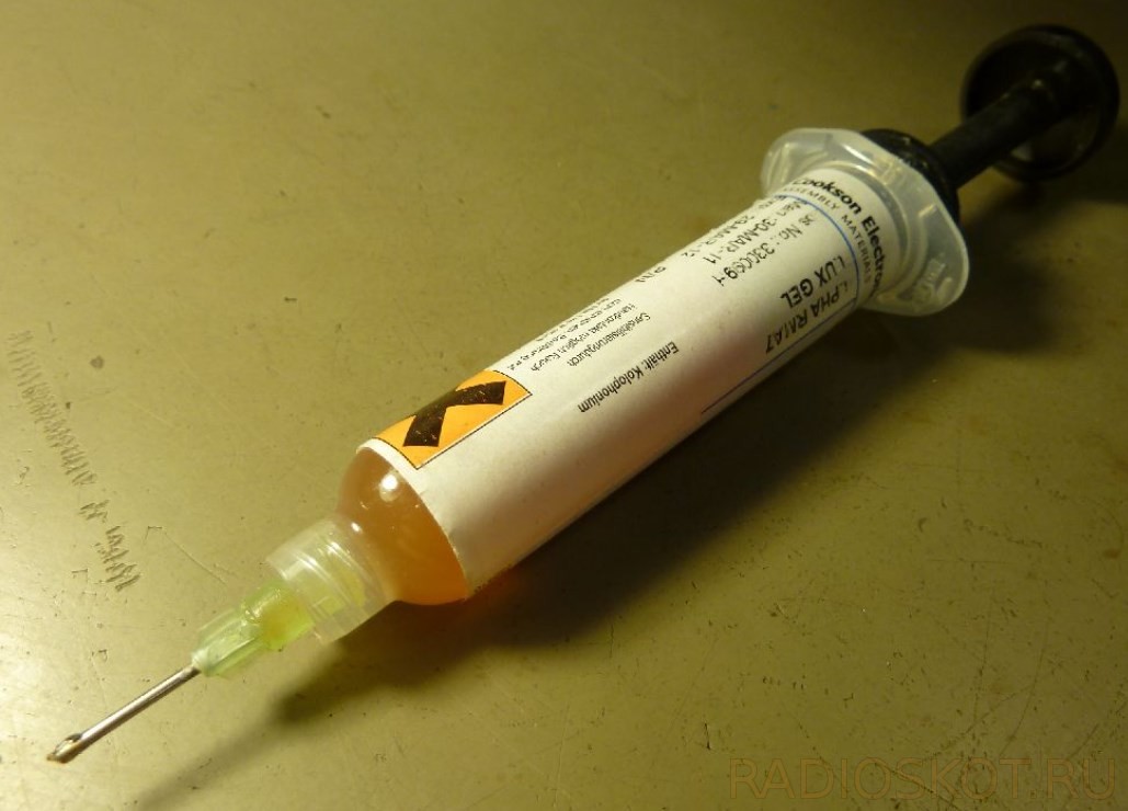 В принципе, TQFP можно паять и без флюса, как и SO, но здесь нужно продемонстрировать, что такое активный флюс. Вы можете купить его в шприцах с маркировкой FLUX.