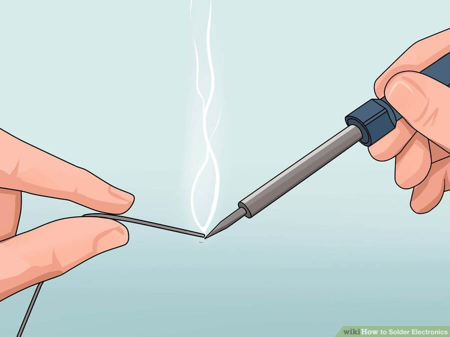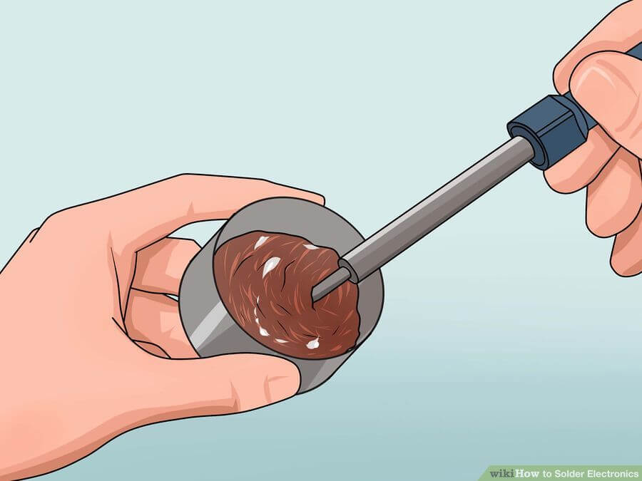 Теперь важно, чтобы на кончике паяльника было небольшое количество олова. Если его много, протрите влажной губкой или стальной проволокой