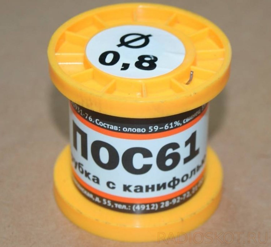 Для пайки медных проводов применяют оловянно-свинцовый припой. Чаще всего это ПОС-61, но можно взять и ПОС-40. Маркировка указывает на состав – припой оловянно-свинцовый с содержанием олова 61%.