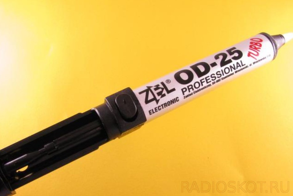 Всасывающее устройство для олова (также известное как оловоотсос или экстрактор) – используется для отсасывания излишков расплавленного припоя. Это простой шприц-инструмент, состоящий из поршня, пружины и приемника для отсасываемого припоя. Он имеет сменный всасывающий наконечник с одной стороны, ручку с другой и кнопку разблокировки сбоку.