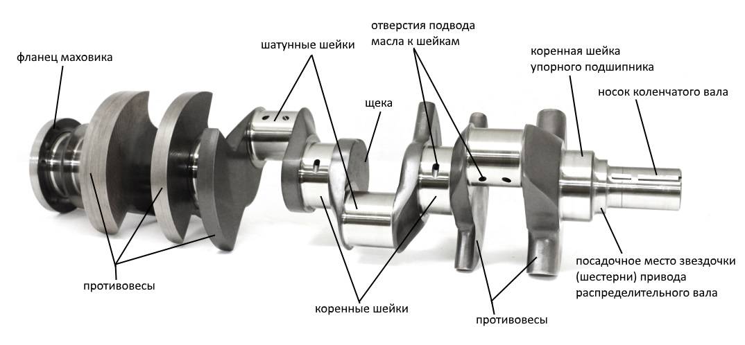 Коренные шейки вала соединены с щеками, которые являются одной из составных частей кривошипа. В верхней части этих щек располагается шатунная шейка.