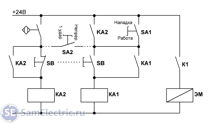 Нажатие на педаль SB – реле КА включается, становится на самоподхват своими контактами КА, и остается включенным до тех пор, пока датчик не разомкнет цепь питания реле. Так может пройти несколько ударов, пока оператор держит нажатой педаль. При отжатии педали цикл удара завершится в верхней точке, в месте перехода датчика через ноль.