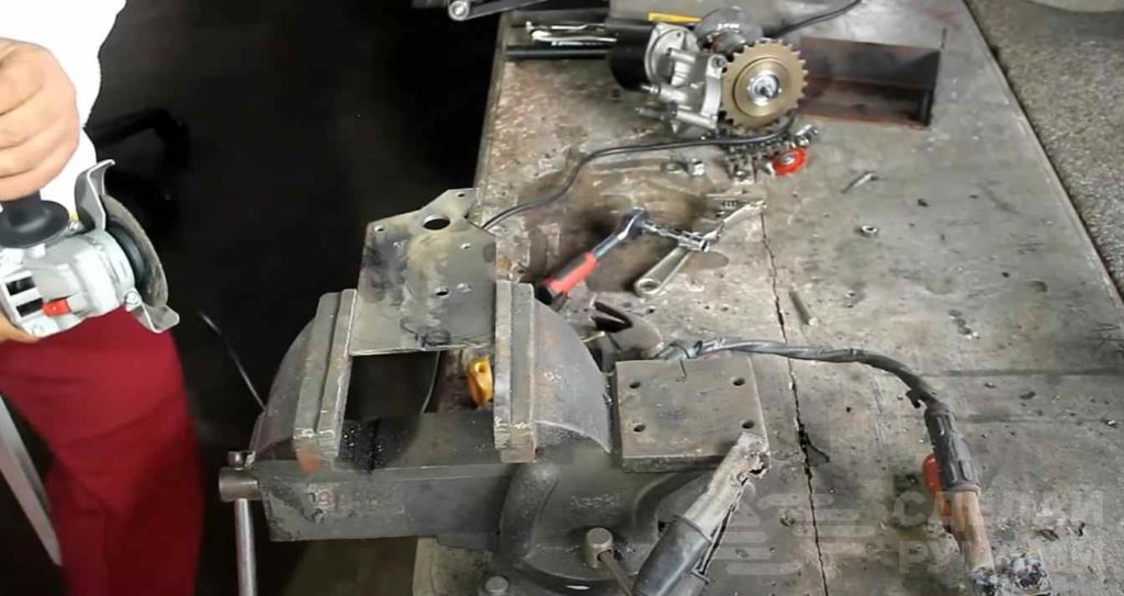 После примерки и проверки работоспособности всех узлов все разбираем и отрезаем от пластины все лишнее болгаркой — придаем ей необходимую форму.