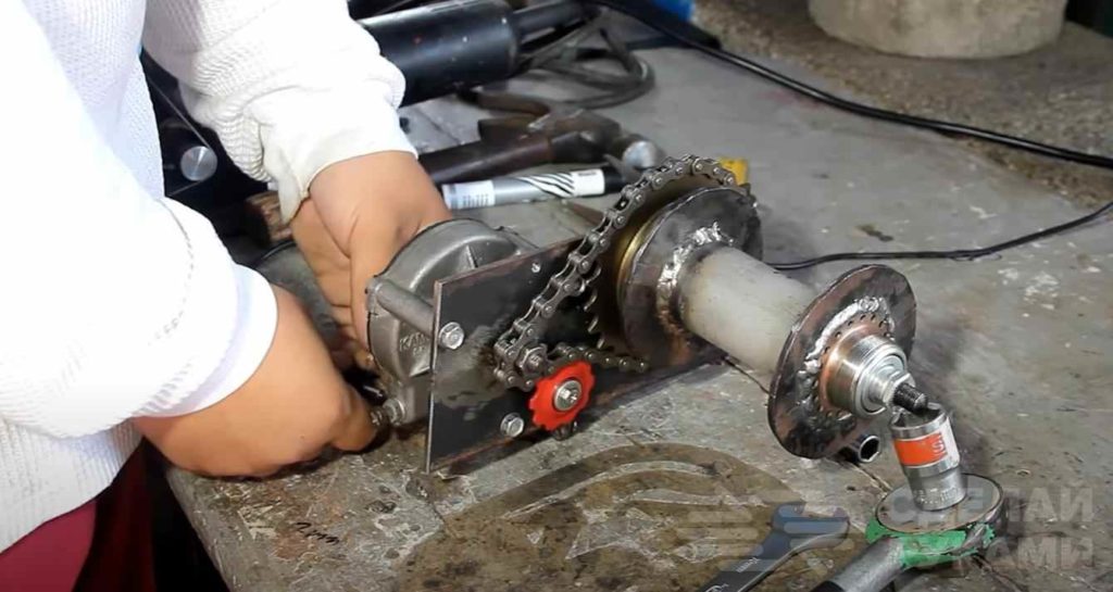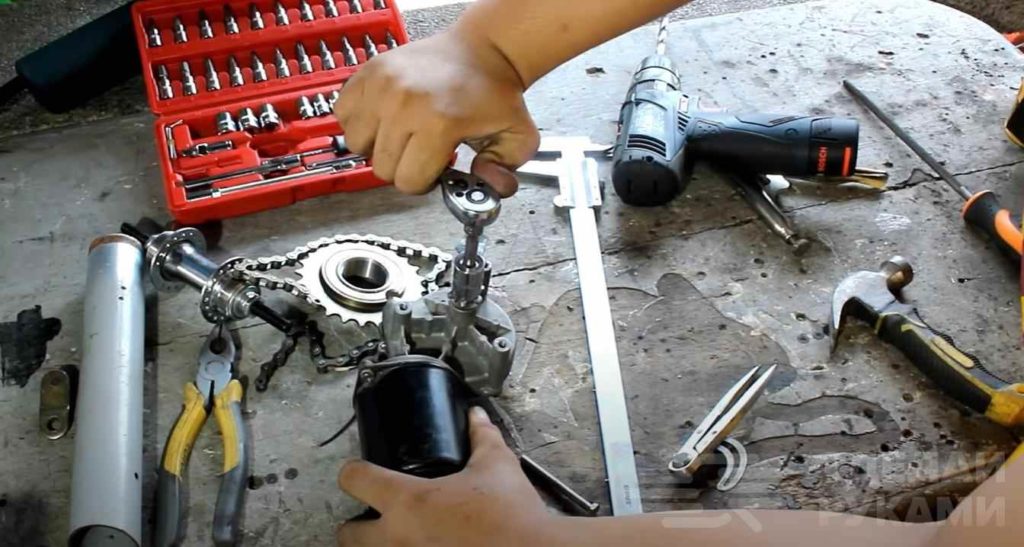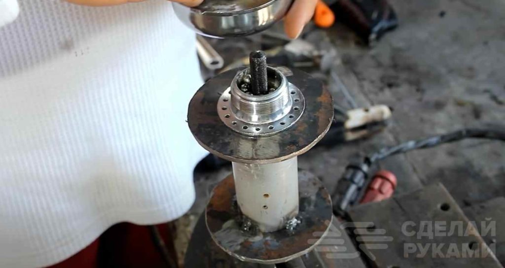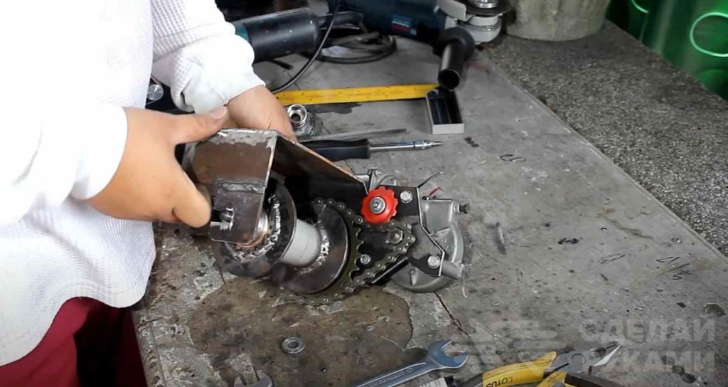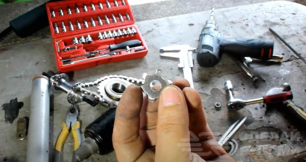 Потом на шпильку надеваем звездочку от велосипеда. Но также можно изготовить и самодельную звездочку.