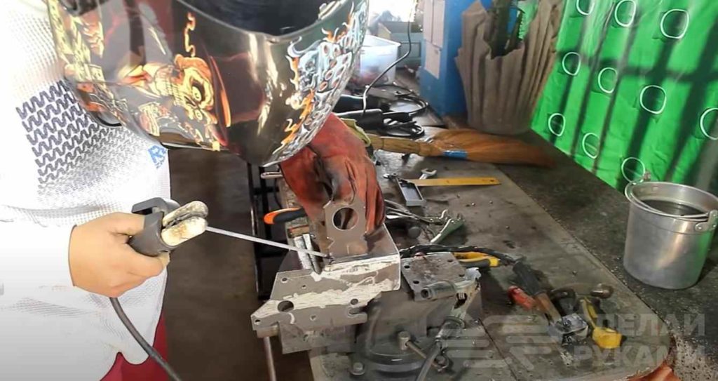 Собираем катушку для троса целиком — вставляем в просверленные отверстия кусок шпильки и привариваем по бокам посадочные места, в которые нужно будет поместить металлические шарики.