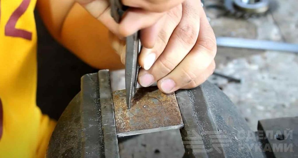 Поскольку вместе шестеренчатого редуктора будет использоваться цепная передача, то первым делом необходимо изготовить приводную звездочку. Для этого берем пластину металла толщиной 3-4 мм. Чертим окружность, а потом делаем разметку для сверления отверстий.