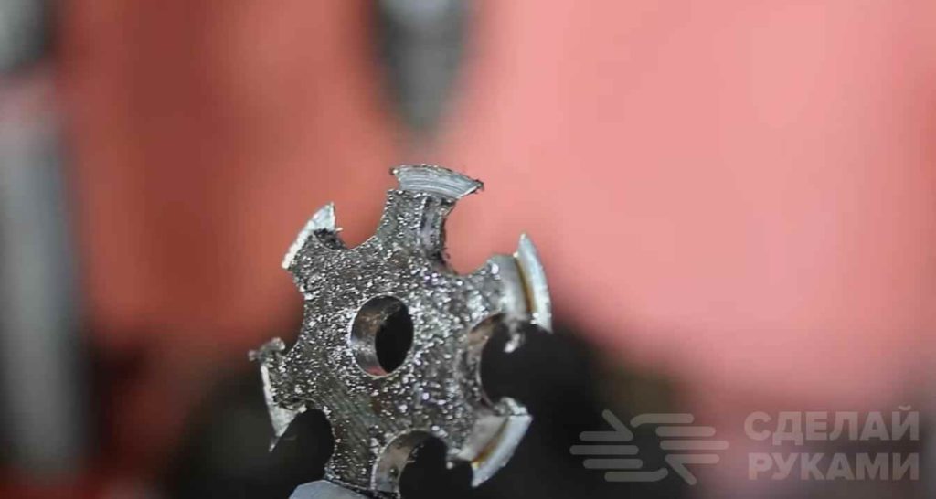 После этого сверлим отверстия по отметкам на окружности (используем для этого сверло 8 мм) и высверливаем звездочку при помощи коронки по металлу.