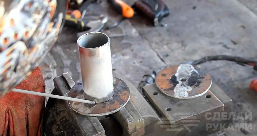Для этого отрезаем кусок круглой трубы и два диска из листа металла, в которых сверлим по центру отверстия диаметром 10 мм. Привариваем диски по краям трубы.