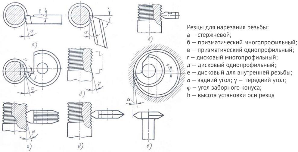 Применяются плоские, тангенциальные и дисковые однопрофильные или многопрофильные (гребенки) резцы (рисунок 1). Профиль резца соответствует профилю впадины резьбы.