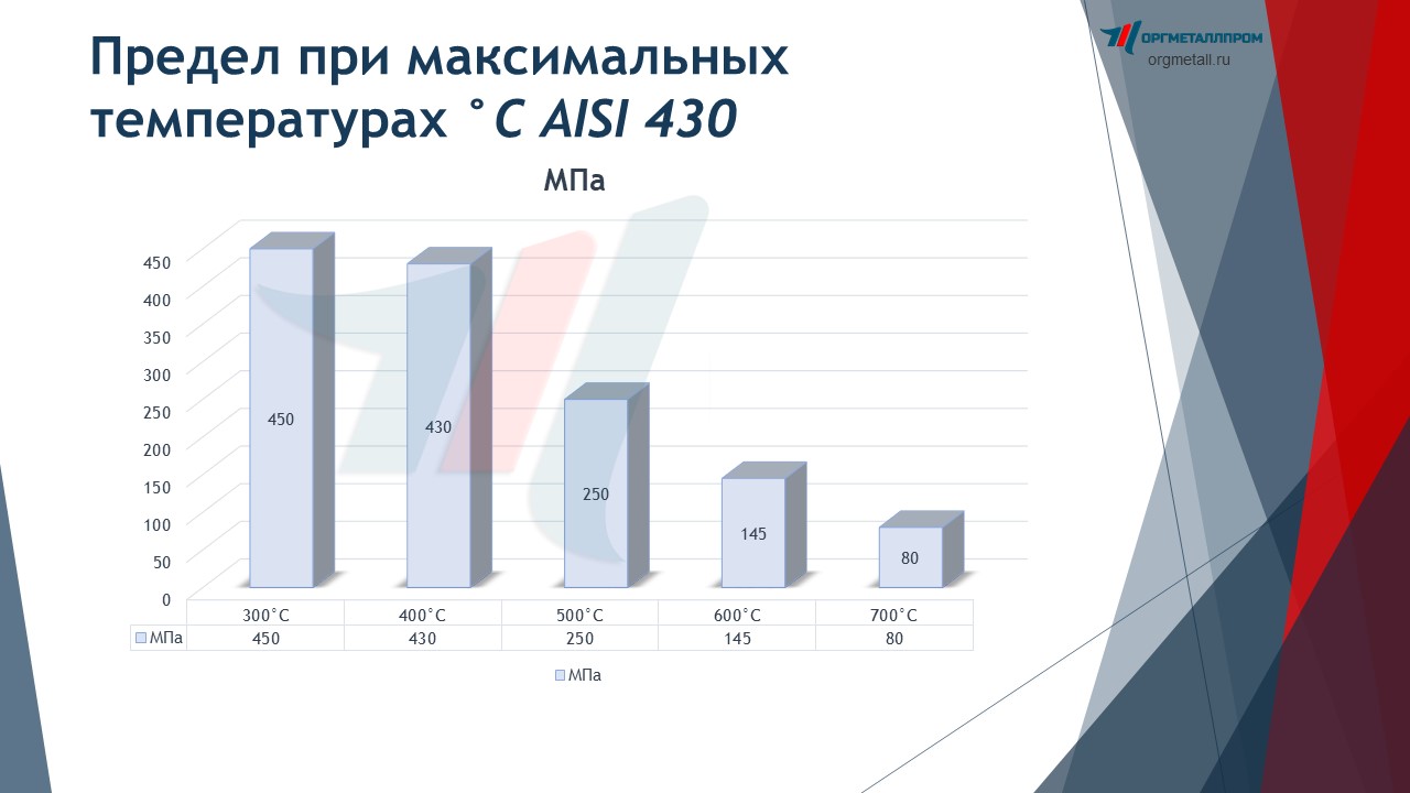 Нержавеющая сталь AISI 430 хорошо ведёт себя при сварке, поскольку она не подвергается коррозии в местах соединения. Однако эта особенность является плюсом лишь при сварке неподвижных соединений, что стоит учитывать в ходе проектирования металлоконструкций. Очень хорошо поддаётся материал отжигу и холодной обработке, становится довольно податливым и пригодным для холодной штамповки, гибки, формовки и глубокой вытяжки. Тем не менее, стоит учесть, что материал плохо переносит отрицательные температуры и высокие нагрузки – это является поводом для того, чтобы не использовать его для изготовления опорных деталей.