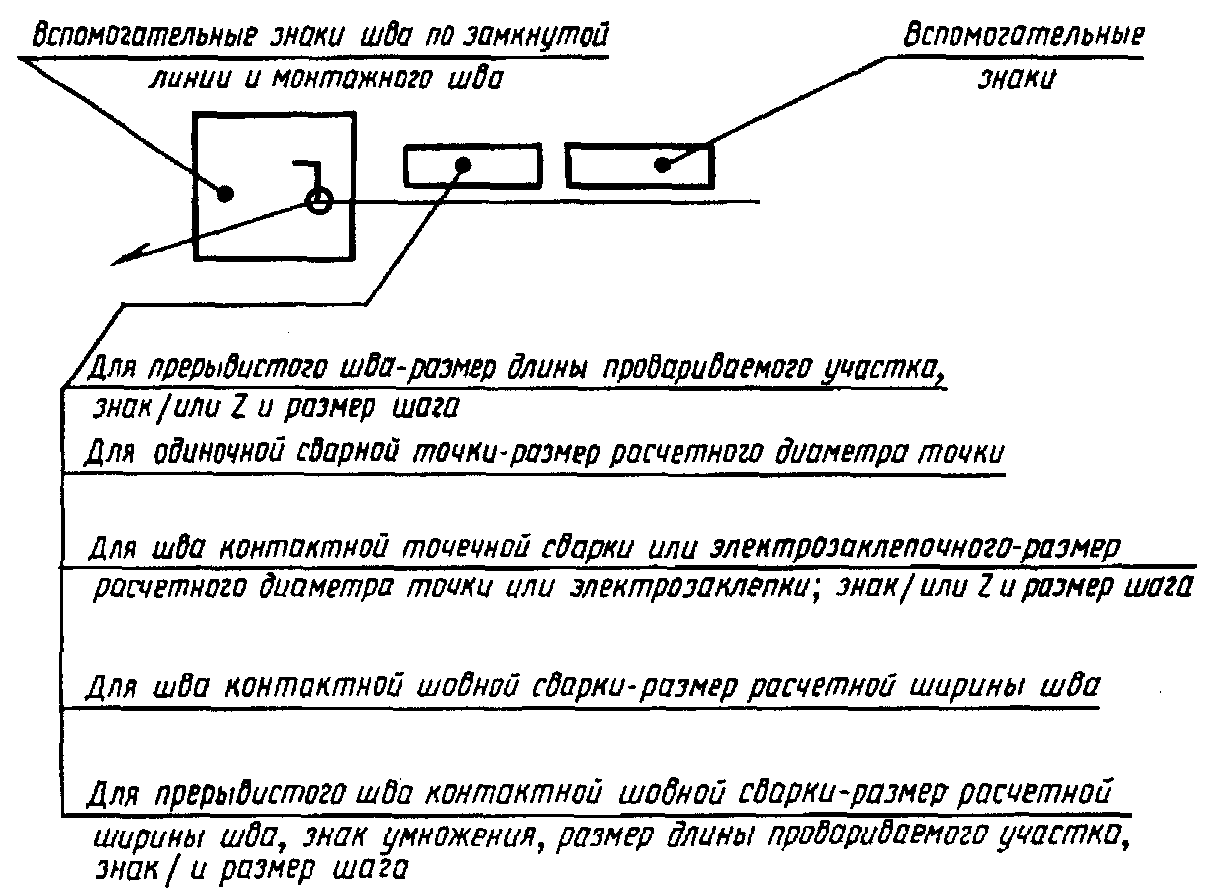 В структуре условного обозначения на чертеже могут присутствовать указания на точечную сварку или газосварку с соответствующими буквенными сокращениями.