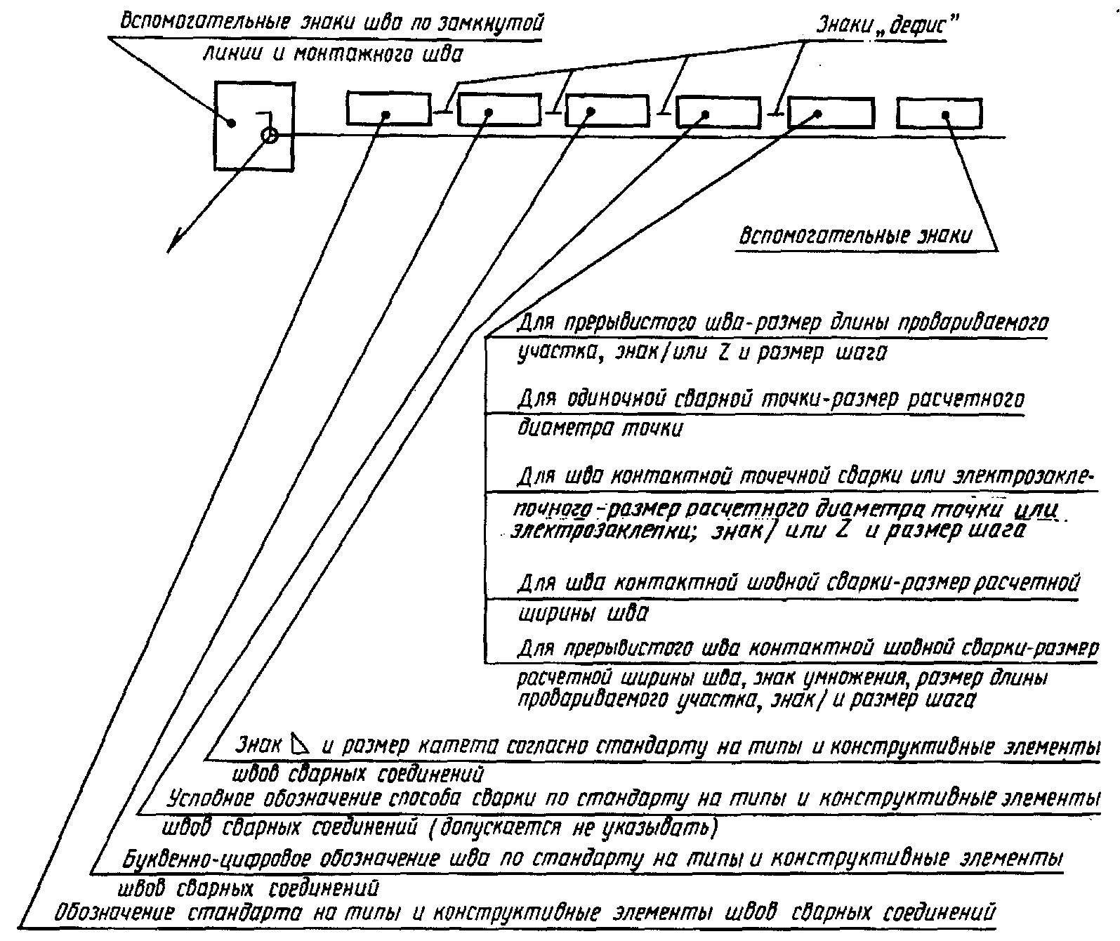 2.2. Структура условного обозначения стандартного шва или одиночной сварной точки приведена на схеме (черт. 5).