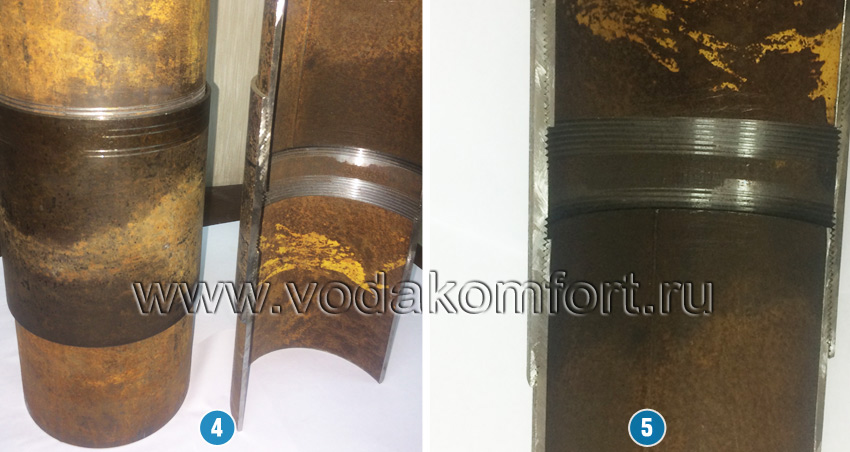 - Резьбовое через муфту. Считается усиленной колонной, способствует более длительному использованию артезианской скважины. На обоих концах трубы нарезается наружная коническая резьба, а на муфте — внутренняя резьба. Данное соединение показано на фото 4 и 5.