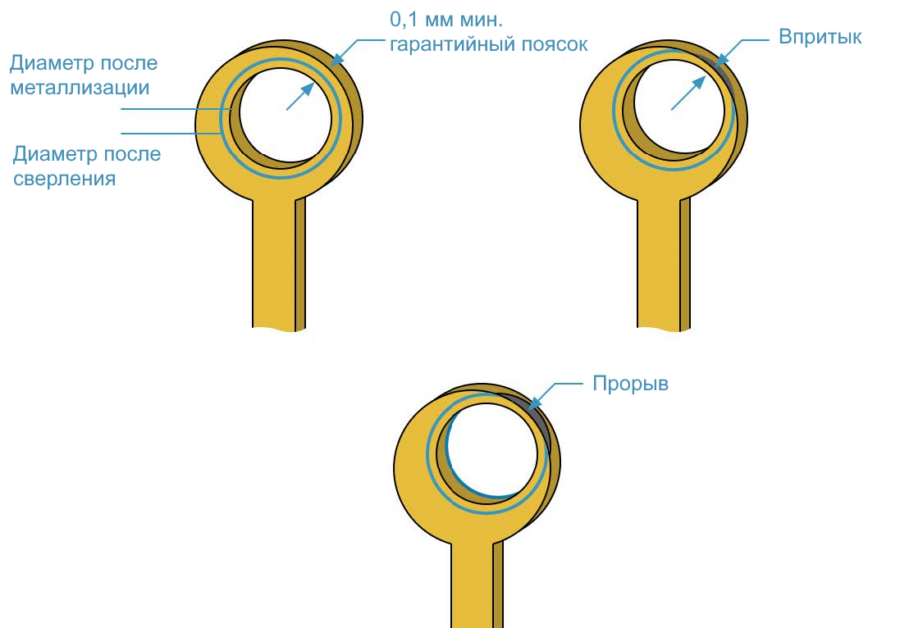 Гарантийный поясок (annular ring) переходного отверстия – это минимально допустимое расстояние между краем отверстия и краем соответствующей контактной площадки в самом узком месте, оставшееся после травления печатного рисунка.