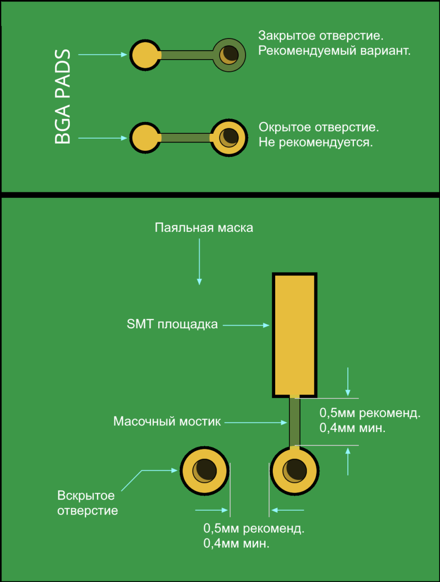 Закрытие переходных отверстий паяльной маской особенно важно в конструкциях с элементами типа BGA, где контактные площадки расположены близко друг к другу (см. Рисунок 12)