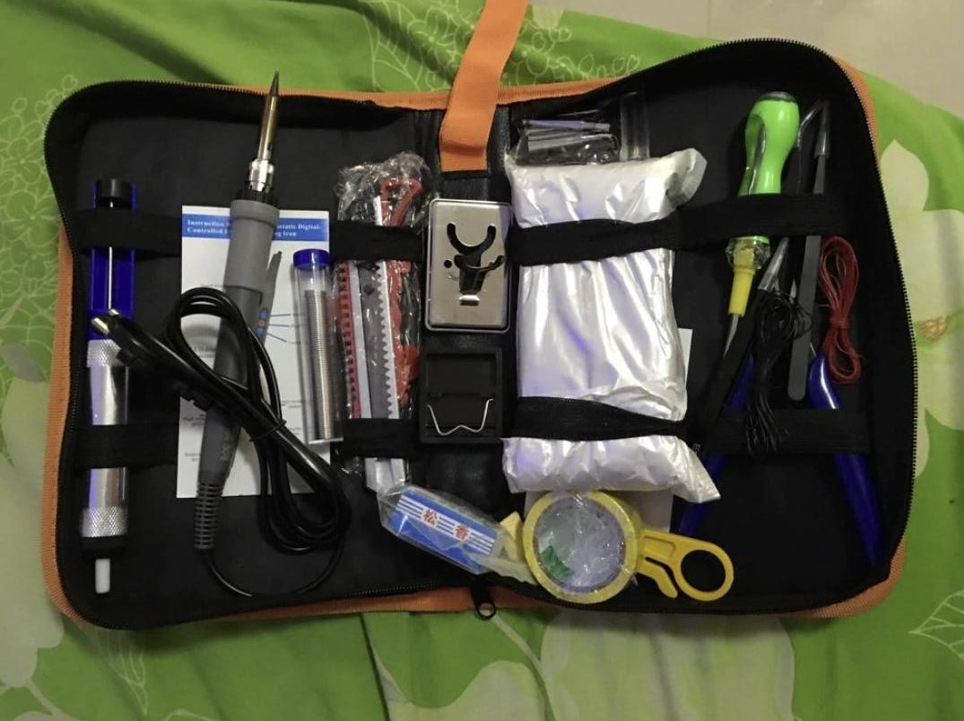 Что мне особенно нравится — очень хорошая комплектация. В набор входят 5 сменных паяльных наконечников разной формы, 6 отверток, припой, подставка с губкой и 8 удобных инструментов, включая два антистатических пинцета. С помощью вакуумного отсоса можно удалять с платы лишний припой. В некоторых комплектациях есть мультиметр.