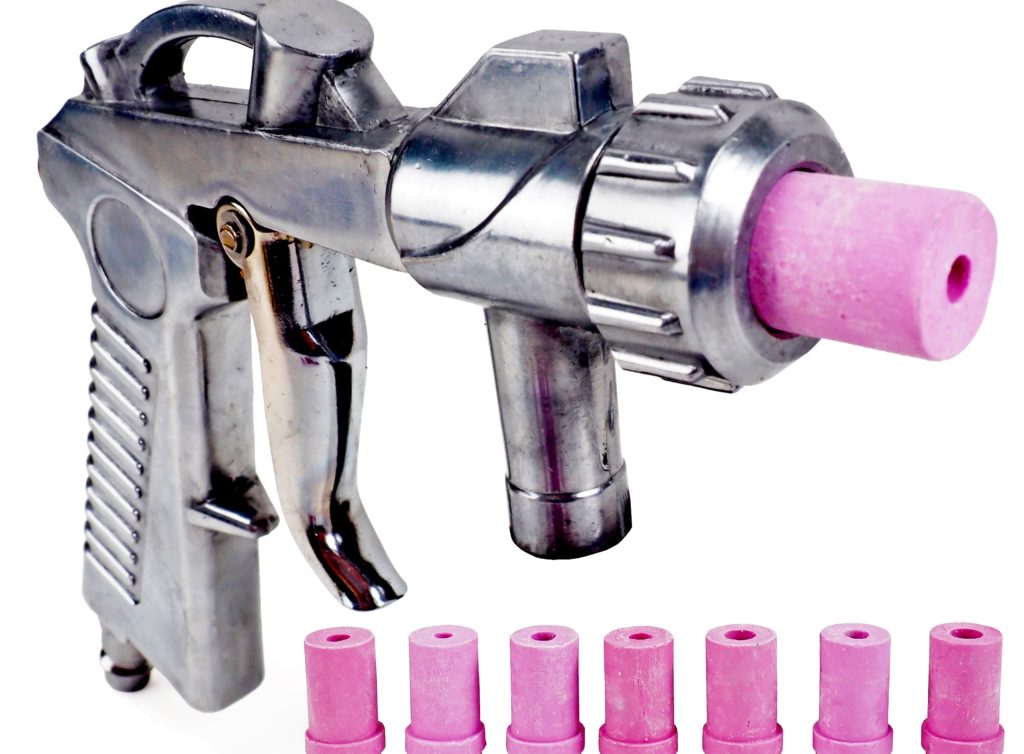 Экономичный, но качественный инструмент. Металлический корпус обеспечивает износостойкость пистолета. Он имеет удобную рукоять и крючок для хранения, оснащен бачком для абразива. стоимость около 850 рублей.