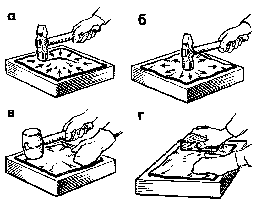 Выпуклость и волнообразность исправляют, ударяя по краям и постепенно двигаясь к центру. По мере приближения к центральной части ударяют чаще, но силу ударов уменьшают. Для корректировки тонких изделий целесообразно применять бруски-гладилки. Правка закаленного металла осуществляется рихтованным молотком.