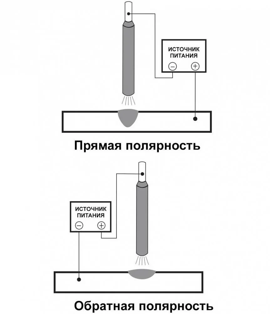 Полярность соединения выбирается исходя из технических условий, необходимых для решения конкретной задачи. Путем изменения типа подключения можно получить концентрацию горячего анодного пятна или на самой заготовке, или на электроде. Непосредственный нагрев осуществляется за счет плюсовой клеммы, поэтому прямое подключение к ней приводит к разогреву данного участка.