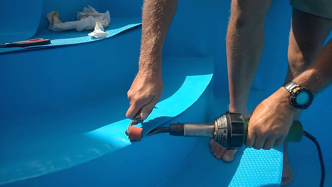 - в последнюю очередь феном обрабатываются внутренние углы бассейна. На этом этапе можно кое-что скорректировать – распрямить остатки полос, обрезать излишки, и потом уже их склеивать.