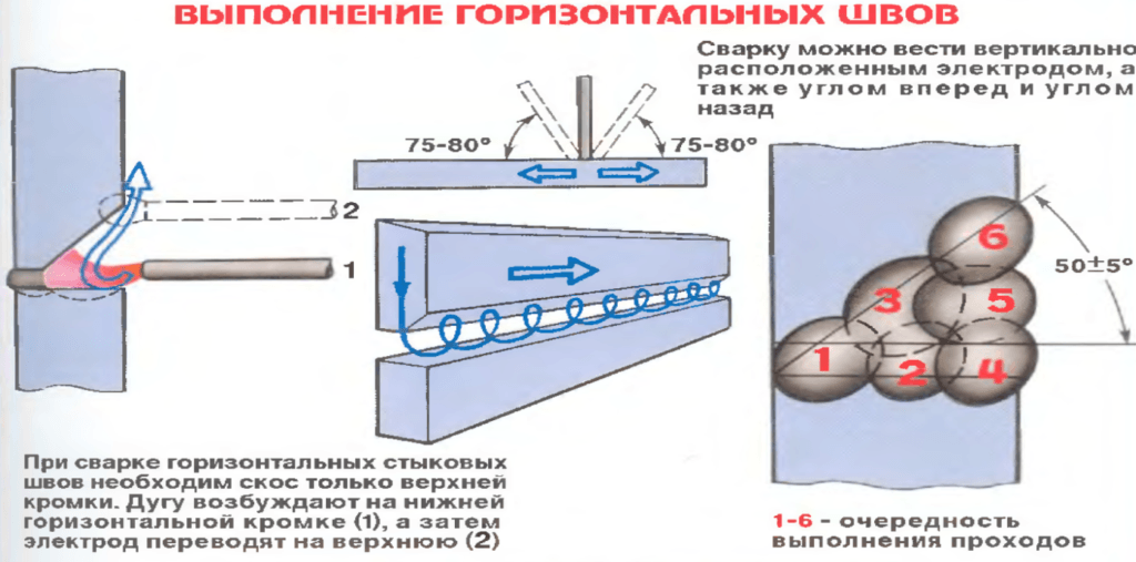 ГОРИЗОНТАЛЬНЫЕ. Стыкуют углом назад. Электрод ведут под 80 градусов к оси. Работают средней дугой. Применяют на трубах и малого, и большого d.