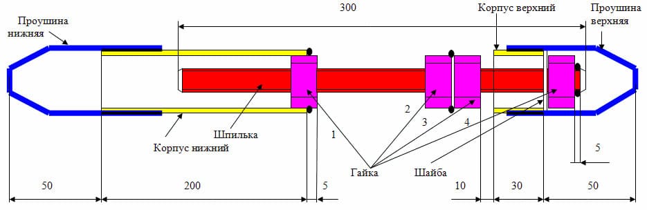 - Резьбовой шпильки, в средней части которой имеется шестигранная неподвижная гайка.