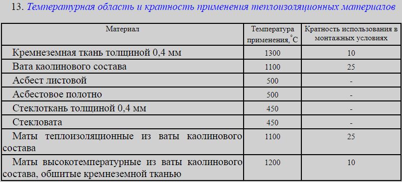 Чтобы сварные швы не теряли тепло изоляционные материалы должны быть прочными и теплостойкими одновременно. При этом они должны иметь малый вес, легко изгибаться. В таблице ниже описаны основные теплоизоляционные материалы, применяемые при термообработке. Также указана из температурная область.