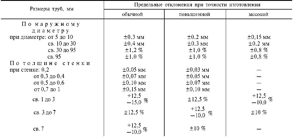 В отличие от рассмотренных выше нержавеющие трубы ГОСТа 9940 изготавливают с диаметрами (наружными) 57–325 мм и со стенкой толщиной 3,5–32 мм. Стандартная максимальная длина этих бесшовных изделий 3–8,5 м. По точности изготовления производят трубы с обычной точностью и с высокой. Иные геометрические размеры и физико-механические свойства, которые описаны ниже, обусловили для труб 12Х18Н10Т ГОСТа 9940 и другие допуски на толщину стенок, диаметр и кривизну.