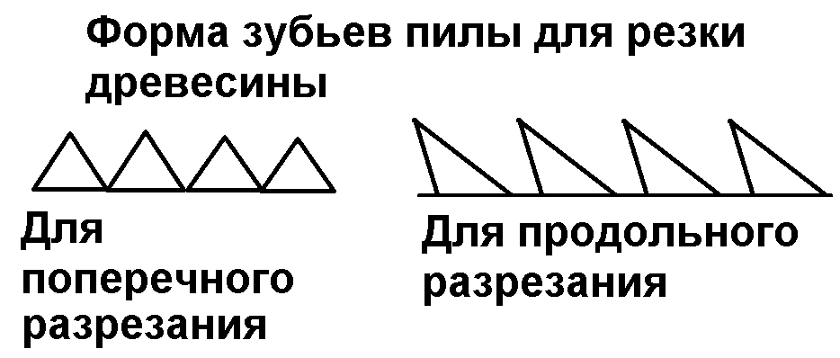 - . Если она предназначена для распиливания древесины вдоль волокон, зубья сделаны с наклоном в сторону пиления (рис.1б). Для смешанного пиления зубья треугольной формы (рис.1в), а для поперечного — в форме равнобедренного треугольника (рис.1а).