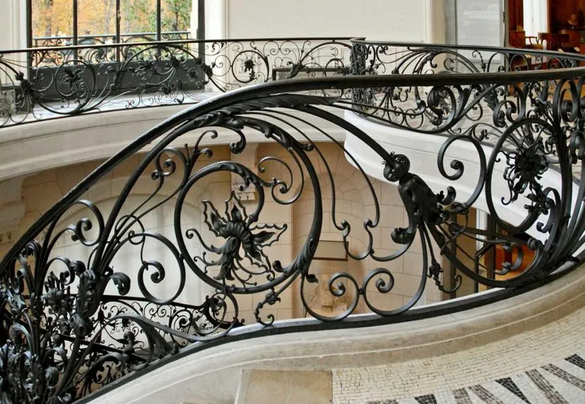 В кованой лестнице в стиле модерн присутствуют прихотливые изгибы симметричных элементов. Стилизованный растительный орнамент может включать и плоские, и объёмные детали.