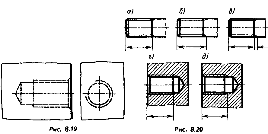Резьбу, показываемую как невидимую, изображают штриховыми линиями одной толщины по наружному и внутреннему диаметрам (рис. 8.19).Длиной резьбы называют длину участка детали, на котором образована резьба, включая сбег и фаску. Обычно на чертежах указывают только длину l резьбы с полным профилем (рис. 8.20, а). Если имеется проточка, наружная (см. рис. 8.16, г) или внутренняя (см. рис. 8.17), то ее ширину также включают в длину резьбы.При необходимости указания сбега или длины резьбы со сбегом размеры наносят, как показано на рис. 8.20, б, в.Недорез резьбы, выполненный до упора, изображают, как показано на рис. 8.21, а, б. Допустимы варианты «в» и «г».