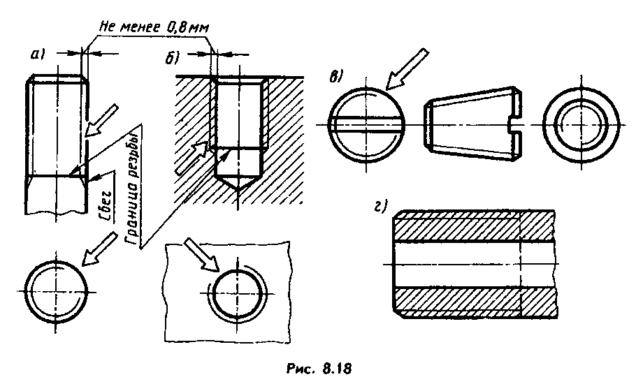 Сплошную тонкую линию наносят на расстояние не менее 0,8 мм от основной линии (рис. 8.18), но не более шага резьбы.Штриховку в разрезах доводят до линии наружного диаметра резьбы на стержне (рис. 8.18, г) и до линии внутреннего диаметра в отверстии (рис 8.18,6).Фаски на стержне с резьбой и в отверстии с резьбой, не имеющие специального конструктивного назначения, в проекции на плоскость, перпендикулярную оси стержня или отверстия, не изображают (рис. 8.18). Границу резьбы на стержне и в отверстии проводят в конце полного профиля резьбы (до начала сбега) основной линией (или штриховой, если резьба изображена как невидимая, рис. 8.19), доводя ее до линий наружного диаметра резьбы.При необходимости сбег резьбы изображают тонкими линиями, проводимыми примерно под углом 30° к оси (рис. 8.18, а, б).