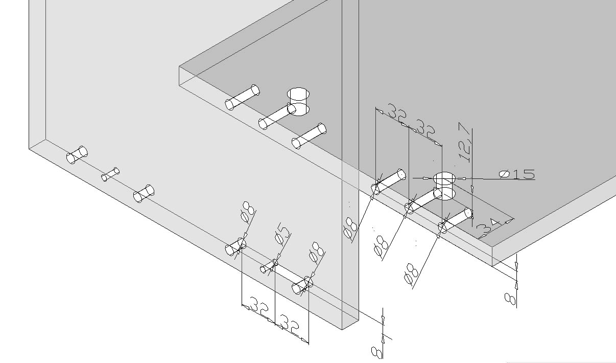 С полкой закончили, переходим ко второй части стяжки. На уровне центра предполагаемой полки проводим перпендикуляр. На нем от задней части откладываем те же расстояния, что и на полке (50 и 250 мм). Рассверливаем их 5 мм сверлом — отверстия глубиной 8 или 11 мм (в зависимости от вида ввинчиваемого штока).