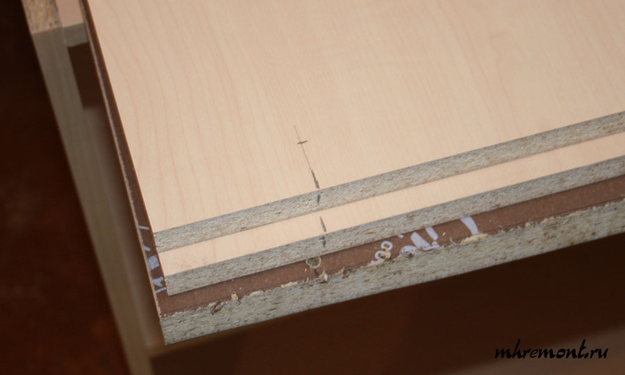 Разметку удобно выполнять следующим образом. Необходимо положить соединяемые детали друг на друга, и отметить линию расположения эксцентриковой стяжки.