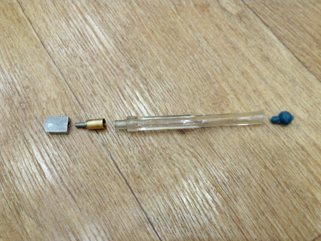 В это время можно заправить свой стеклорез. Масло заливается в ручку примерно на 2/3 высоты резервуара. Скорость подачи жидкости корректируется поворотами колпачка. Для подобной отладки берут ненужный кусок стекла и стремятся получить наиболее качественную линию реза. Чтобы жидкость потекла в рабочую зону, на инструмент надавливают сверху.