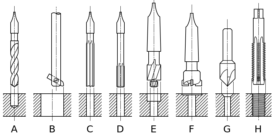 А — сверление сверлом В — растачивание на токарном станке С — зенкерование зенкером D — развёртывание развёрткой E,F — цекование цековкой G — зенкование зенковкой H — нарезка резьбы метчиком